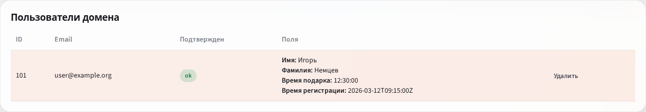 Нижняя таблица показывает всех пользователей домена. Нажмите на строку, чтобы загрузить пользователя в форму редактирования. В таблице видны email, статус подтверждения, значения полей профиля и кнопка Удалить для немедленного удаления пользователя.