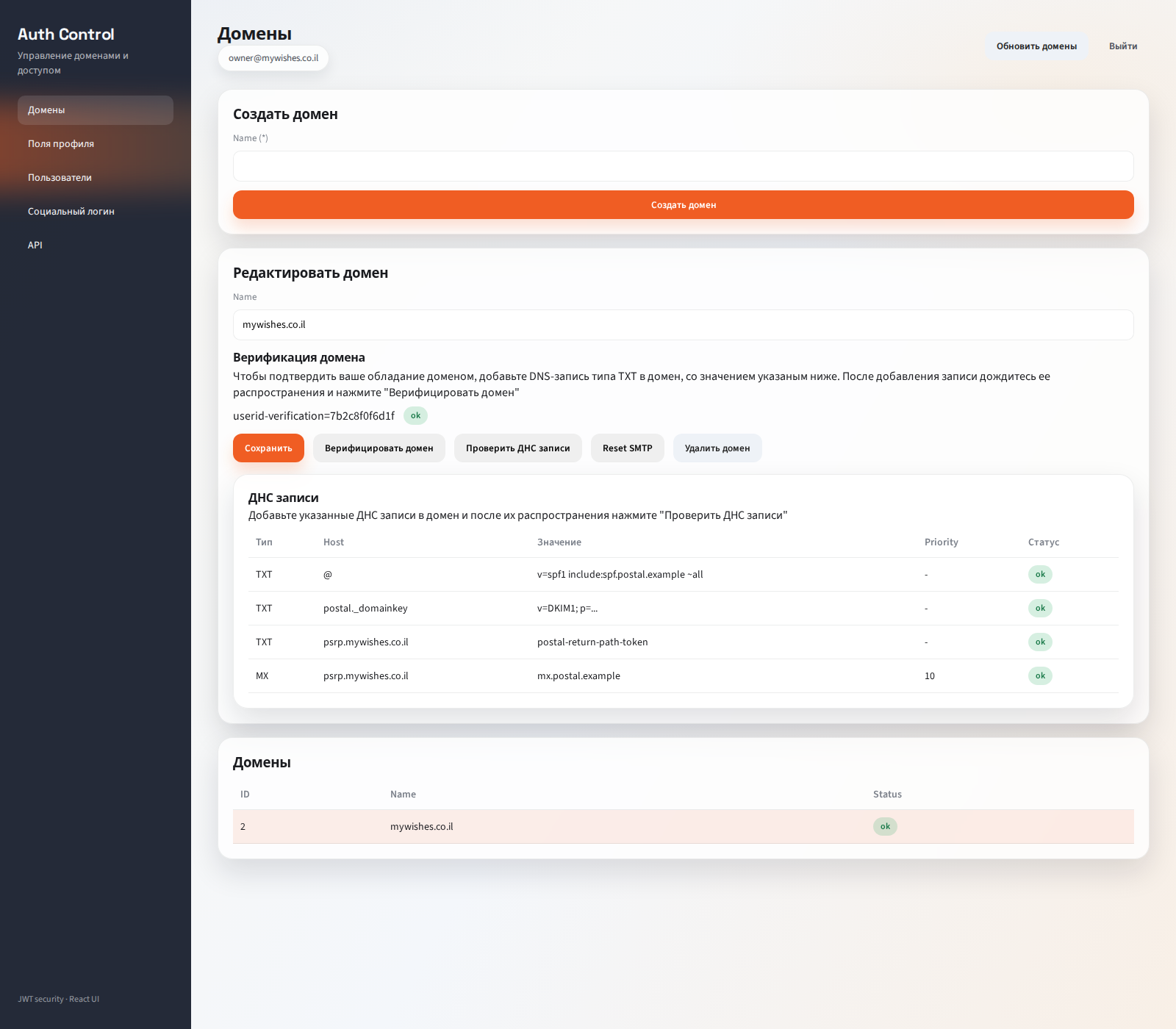 После входа открывается рабочее место владельца домена. Здесь выполняются все основные действия: создание и верификация доменов, настройка полей профиля, управление пользователями, настройка социального логина и получение данных для интеграции.