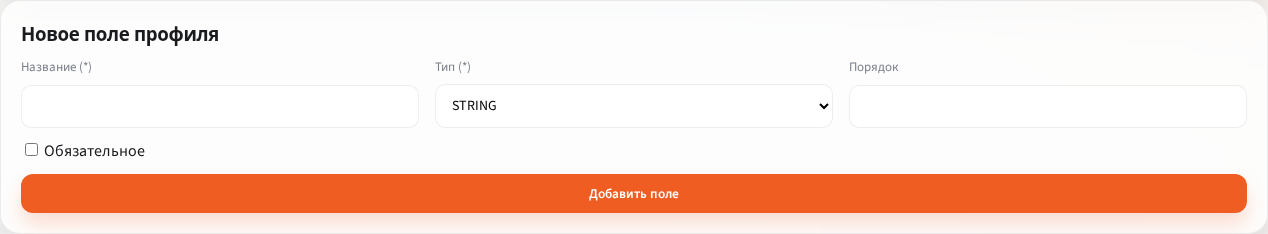 Чтобы создать новое поле, заполните блок Новое поле профиля. Укажите название, тип значения, при необходимости порядок отображения, отметьте флаг Обязательное и нажмите Добавить поле.