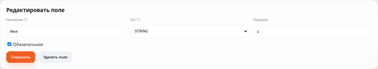 Чтобы изменить существующее поле, нажмите на строку в таблице. После этого в блоке Редактировать поле можно изменить название, тип, обязательность и порядок, сохранить изменения через Сохранить или удалить поле через Удалить поле.