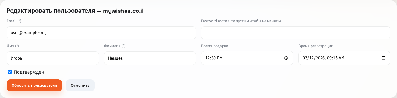 В центральной форме создается новый пользователь или редактируется уже существующий. Для создания заполните email, пароль и значения полей профиля и сохраните форму. Когда пользователь выбран в таблице, эта же область переключается в режим редактирования: появляются кнопки Обновить пользователя и Отменить, а также флаг Подтвержден.