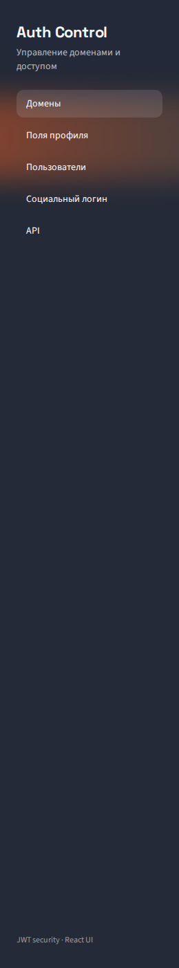 Слева находится основное меню. Пункты Домены, Поля профиля, Пользователи, Социальный логин и API переключают центральную рабочую область на нужный раздел.